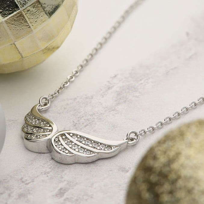 Sterling Silver Angel Wings set with Cubic Zirconia suspended on a trace chain.
